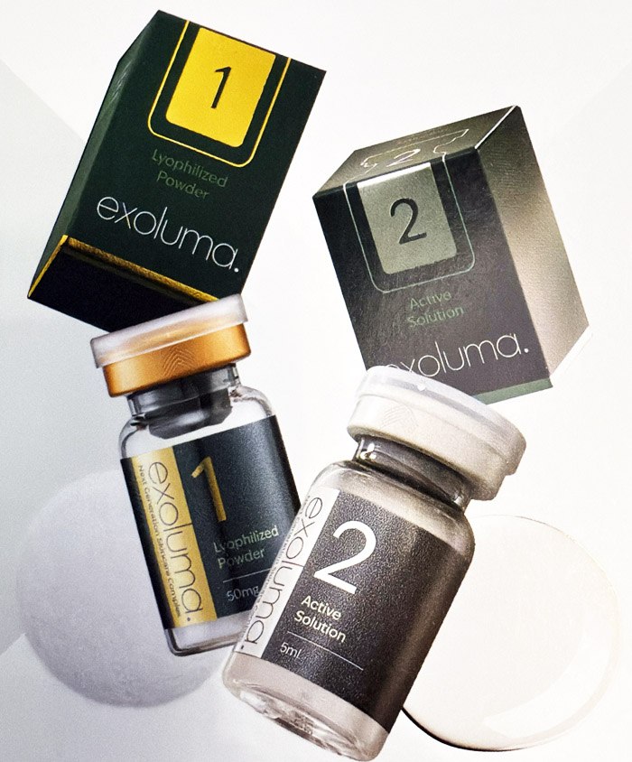 EXOLUMA EXOSOMES — двухкомпонентный комплект: лиофилизированная часть смешивается с активным раствором перед использованием. Продукт позиционируется для профессионального применения в эстетических протоколах ухода за кожей, где требуется поддержка качества кожи и восстановления после процедур.